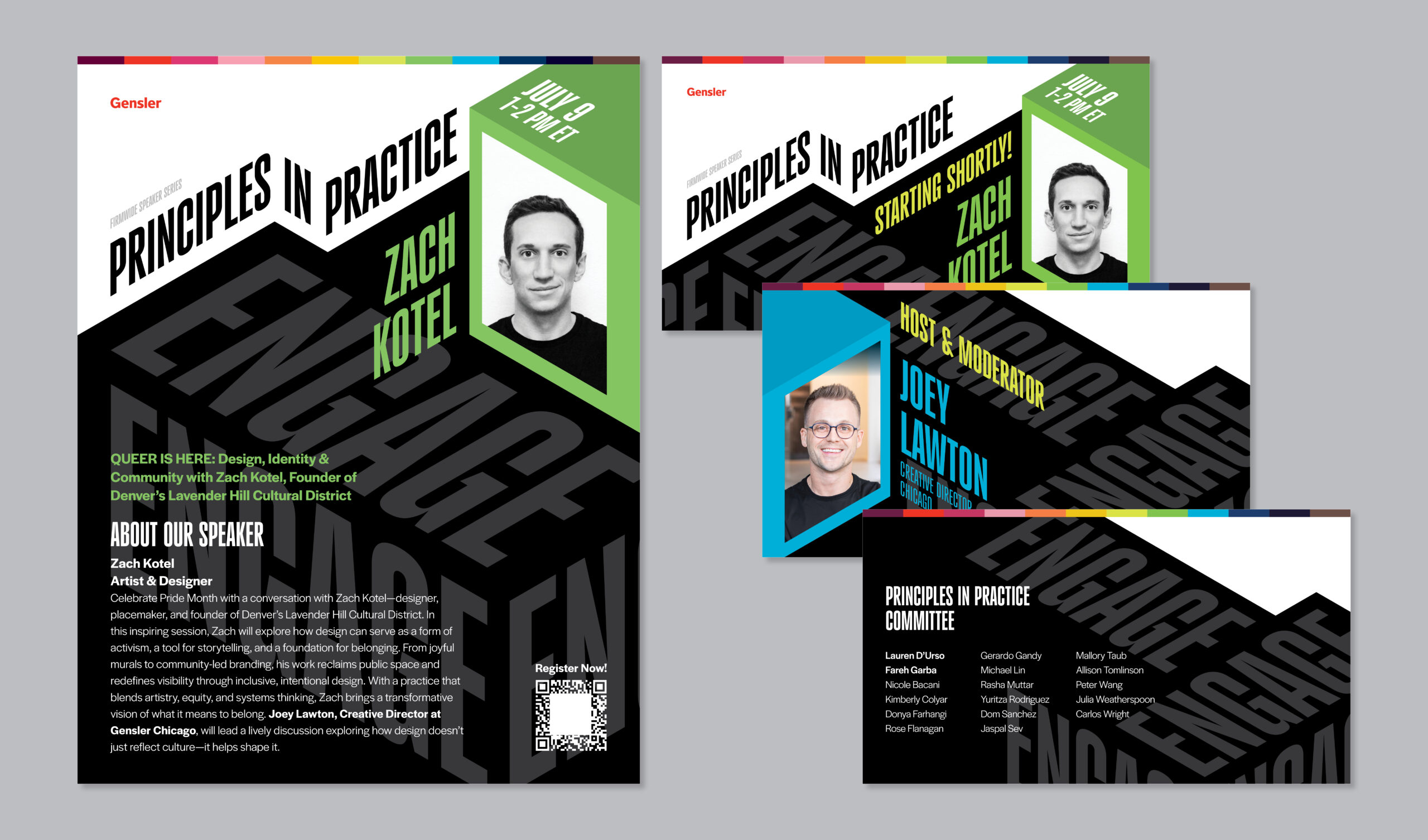 A firm-wide speaker series which acts as a platform for bold voices exploring the intersection of design and inclusion, and aims to deepen the understanding of both historical and contemporary challenges and how design can respond. The series identity was inspired by ideas of purpose and direction, with a logo that takes inspiration from an axonometric grid as a representation of architectural work. The poster and slides followed suit with additional bold, layered, and angular details.